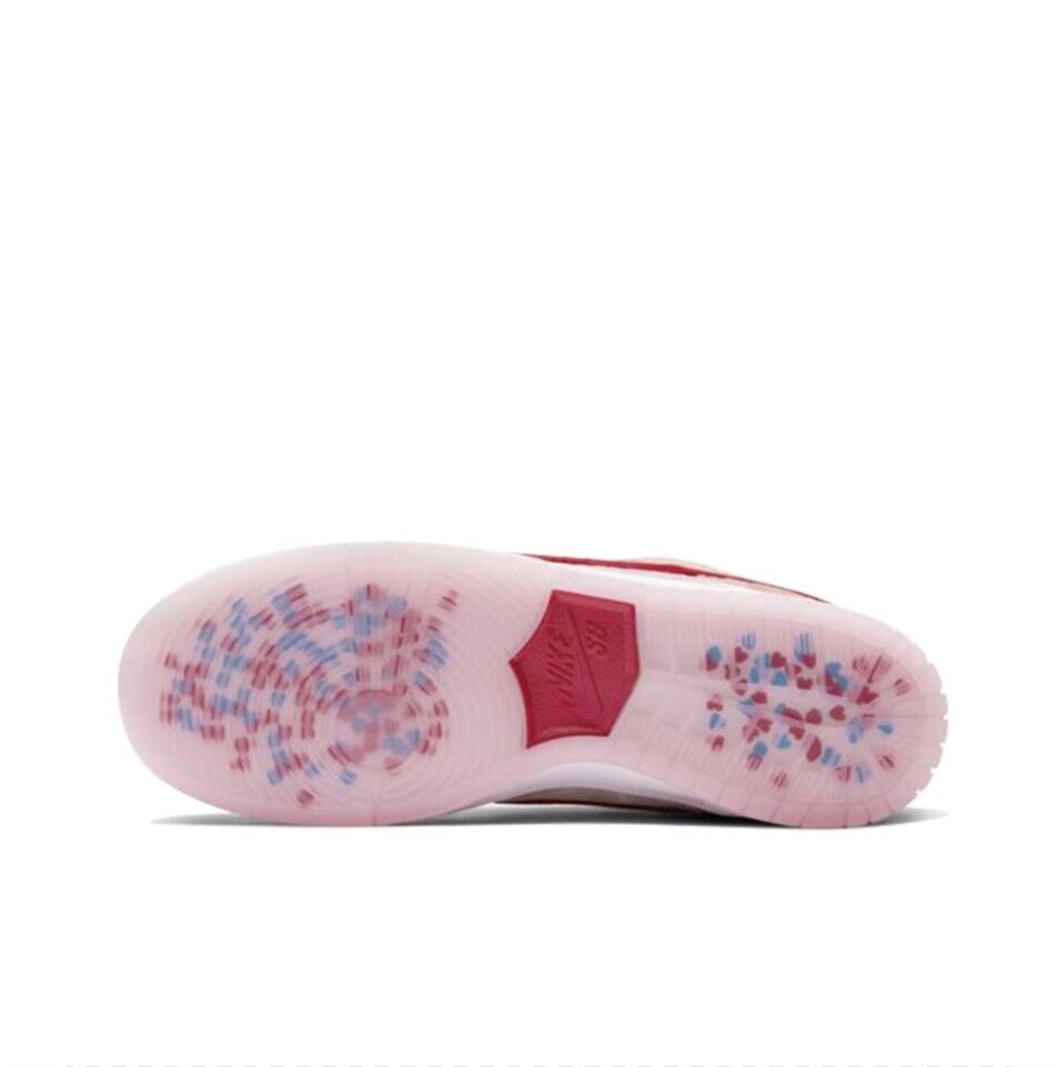 This SB Dunk Low is composed of a pink velvet upper with suede overlays and a red velvet Swoosh. Strangelove branding on the tongue, insole, and translucent outsole completes the design. These sneakers released in February of 2020 .