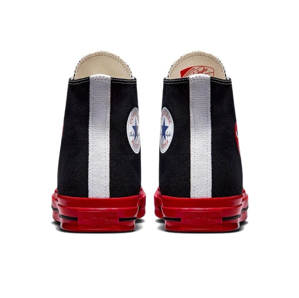 The Converse CDG Comme des Garçons PLAY x Chuck 70 High sneakers in size 11 are a stylish addition to any wardrobe. With a high top shaft style and black canvas upper, these athletic shoes from the Converse Chuck 70 line are the perfect blend of fashion and functionality. Made for men, these sneakers feature the iconic Converse branding and are sure to make a statement in any casual outfit. Perfect for those looking for a comfortable and trendy footwear option, these Chuck 70 High sneakers are a must-have for sneaker enthusiasts.