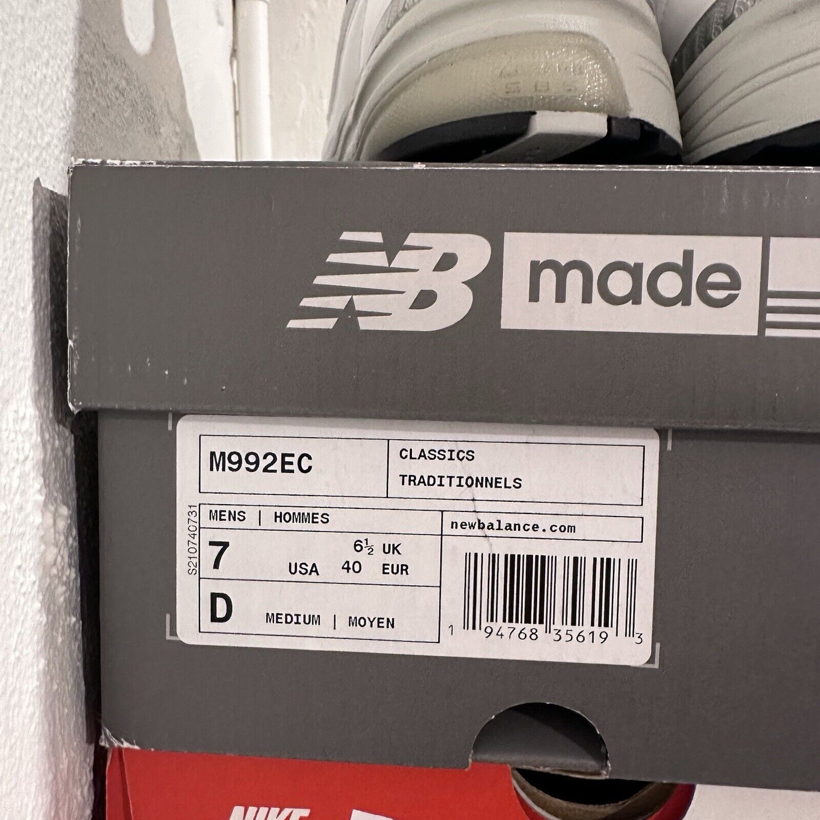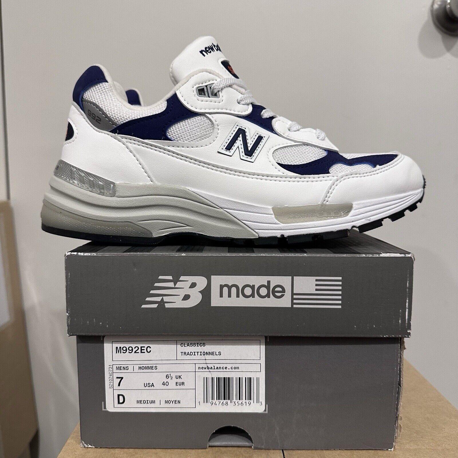 Step up your sneaker game with the New Balance 992 Made in USA. This stylish and comfortable athletic shoe features a multicoloured suede upper, with white and navy accents. The shoe is available in a men's size 7, with UK size 6.5 and EU size 40.