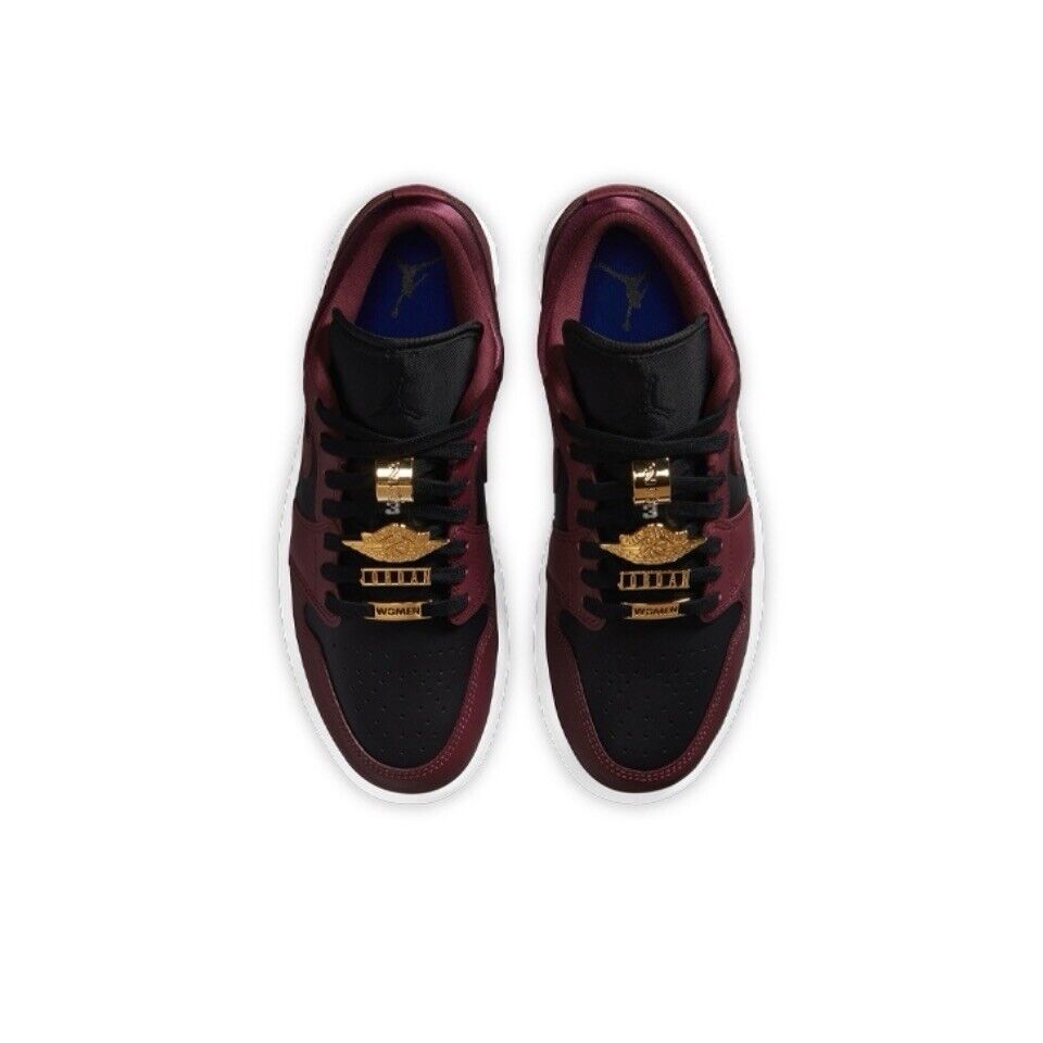 The Air Jordan 1 Low Dark Beetroot Black W is a sneaker that is dressed in a mix of dark beetroot, white, and black.